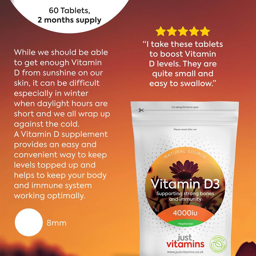 Our 4000iu high strength Vitamin D supplement provides 100µg (2000% NRV) in an 8mm round, odourless tablet with no coating. We use a high quality natural form of Vitamin D, Cholecalciferol (Vitamin D3) in this supplement - the form of Vitamin D most readily absorbed by the body. Our manufacturing process gives us a highly concentrated form of Vitamin D3 which offers 99% purity and unbeatable quality.